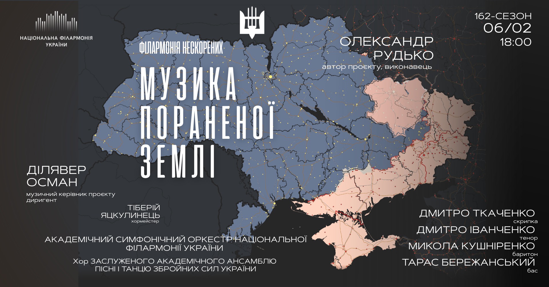06 лютого 2026 року рамках проєкту «Філармонія Нескорених» у Національній філармонії України відбудеться концерт «Музика пораненої землі».