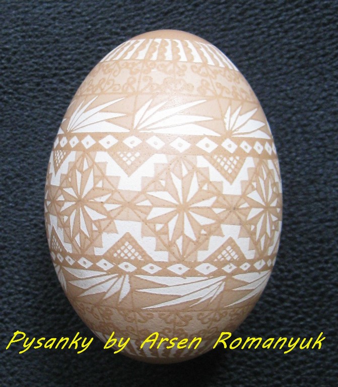 Арсен Юрійович Романюк, народився 29.09.1987. Проживаю у Львівській області в селі Добрівляни. Захопився писанкарством півроку тому. Спочатку користувався саморобними писачками, але скоро зрозумів, що мені цього мало і купив електричний. Писанки мене захопили повністю, це те, чим я хочу займатися завжди, нарешті я знайшов себе. Довгий час працював з курячими яйцями, тепер перейшов на гусячі, маю надію що повністю, – з ними працювати легше і приємніше.