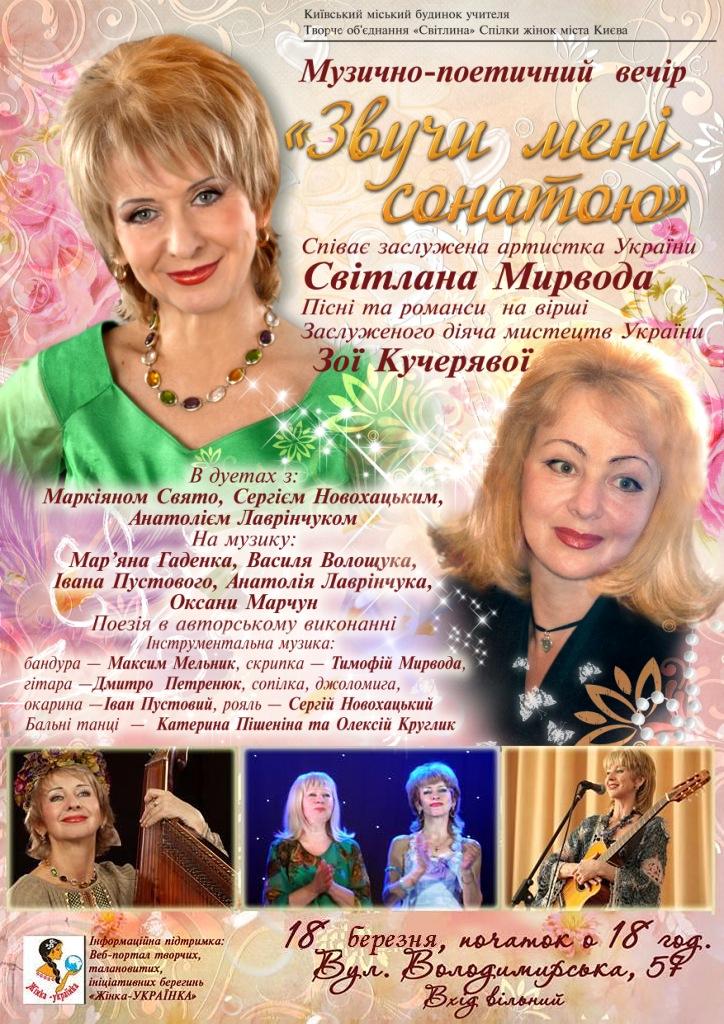 18 березня о 18 годині в Київському міському будинку вчителя відбудеться музично-поетичний вечір «Звучи мені сонатою».