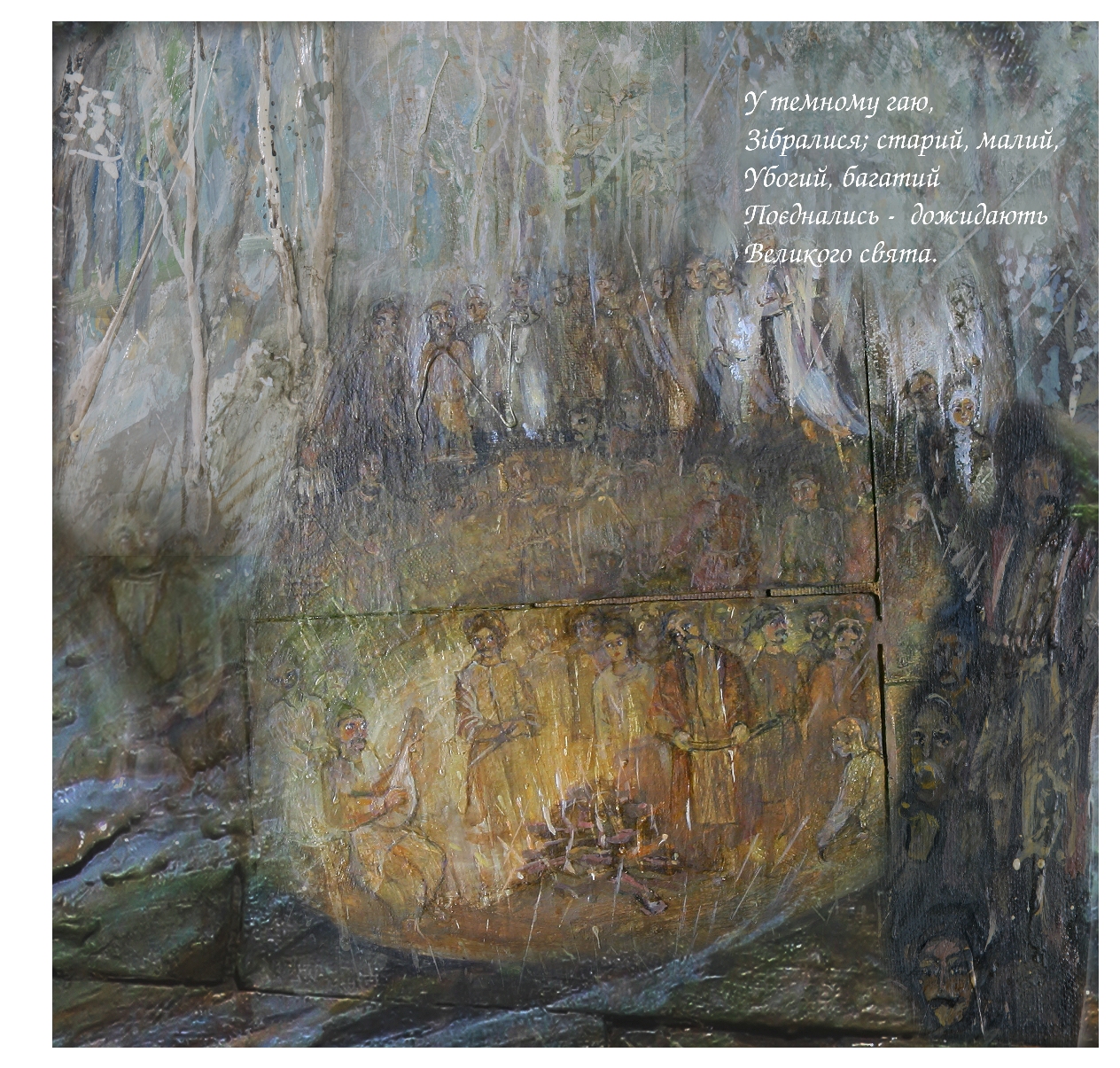 У лівому нижньому куті — могила з хрестом, що перев’язаний рушником; поряд сидить кобзар. Тут образ кобзаря знову наводить на роздуми про спосіб існування, про пророчі бачення («коб» — «віра», «зар» — «зрячий») .