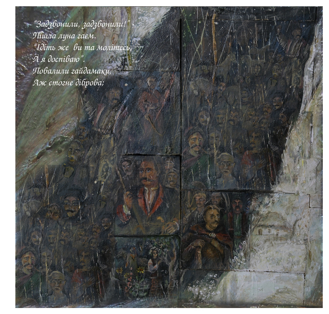 Відзначимо з боків постаті Кобзаря малюнки за роботами Шевченка: ліворуч «У Василівці» (1845), «Хата батьків Т.Г. Шевченка в с. Кирилівці» (1843); праворуч — «Аскольдова могила» (1846). А навколо… Україна! І це не випадково. Адже усі есхатологічні уявлення мистця були пов’язані лише з батьківщиною. Уперше він про це скаже в 28 років у листі до викладача Другої Харківської гімназії П.М. Корольова: «Молю тілько милосердного бога, щоб поміг мені весни діждати, щоб хоч умерти на Україні». Ця думка найбільше відома загалу через поезію «Як умру, то поховайте» (25 грудня 1845 р.), яку зазвичай називають «Заповіт».