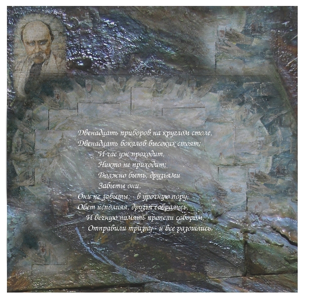 Органічна цілісність власне портрета Шевченка і тла досягається композиційною побудовою. Вінчає роботу один із сюжетів поетової «Тризни» (1843): навколо голови ореол, що подано через стіл-півколо, за яким розміщено попарно руки дванадцятьох друзів. У руках — наповнені вином келихи: