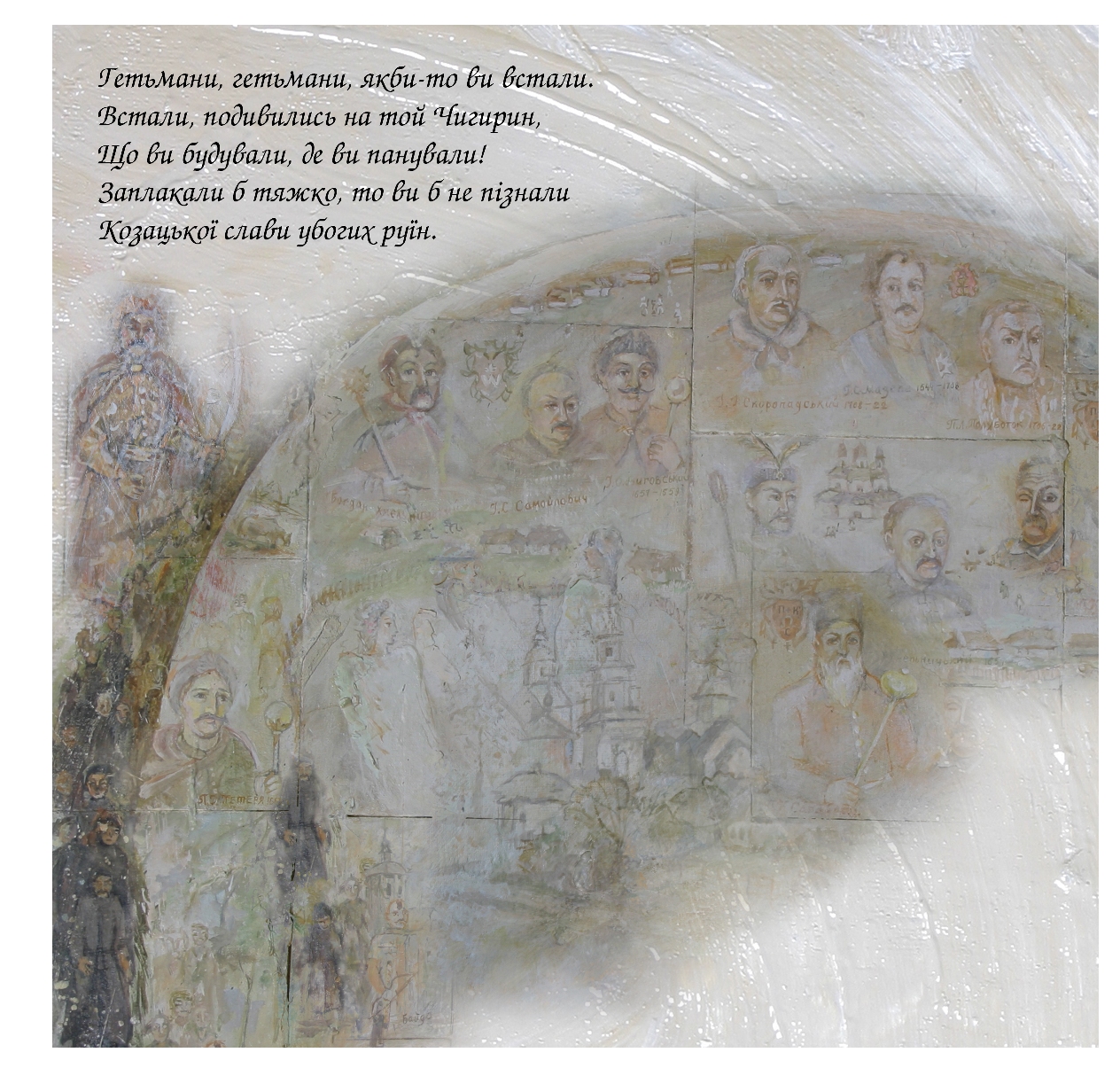 Портрети гетьманів України, як персоніфікація державної влади, заповнюють, відповідно, — верхню частину високого світлого чола поета; нижче них — будівлі церков — матеріальні пам’ятки української старовини та архітектури, видимі осередки духовності. Церкви намальовано за роботами Т. Шевченка: «Мотрин монастир» (акварель), «Богданова церква в Суботові» (акварель), «Чигиринський дівочий монастир» (сепія). Ці роботи виконані художником 1845 року під час подорожі на Полтавщину та в суміжних місцях Київщини.