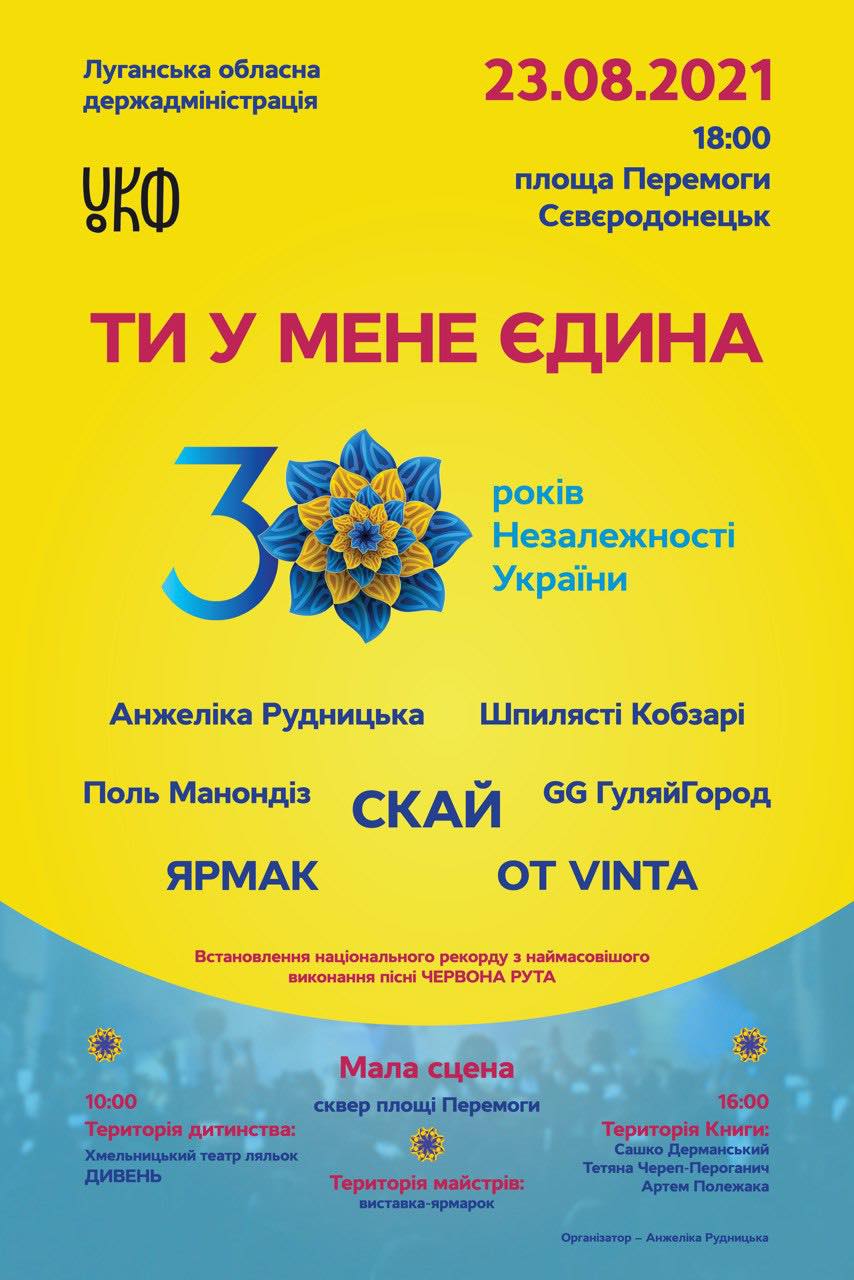 Анжеліка Рудницька за підтримки Українського культурного фонду і Луганської обласної держадміністрації представляють до 30-ліття Незалежності України мегашоу "ТИ У МЕНЕ ЄДИНА" 23 серпня 2021 року в м. Сєвєродонецьк на площі Перемоги.